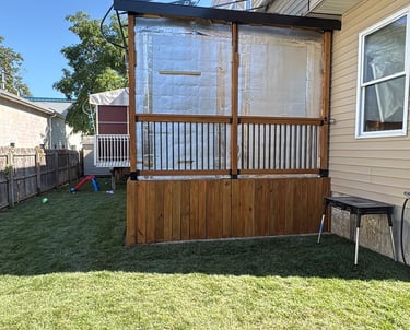 This elevated deck was built using pressure-treated wood for enhanced strength and longevity. It features sturdy vertical railings for safety and a simple, clean look. The design includes a set of stairs for convenient access, making it an ideal addition for expanding outdoor living space and creating a functional area for relaxing or entertaining.