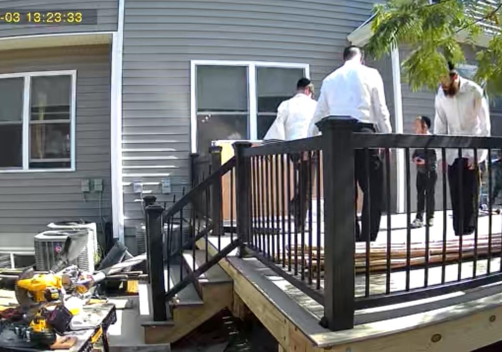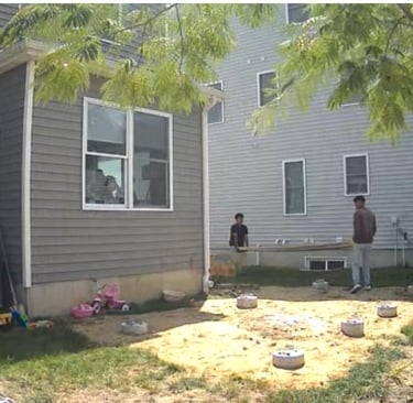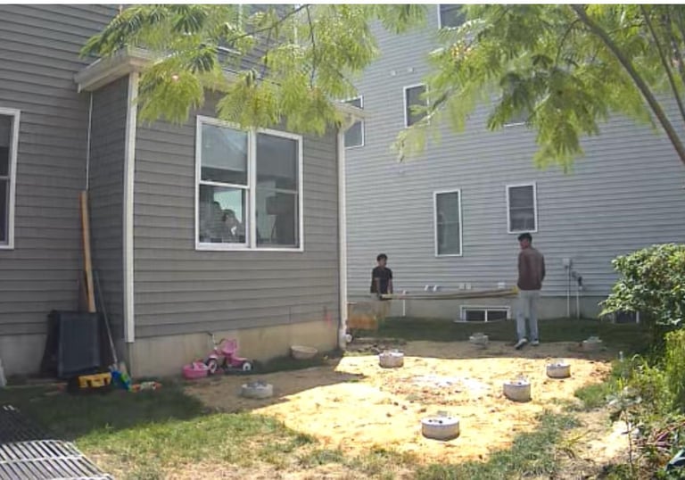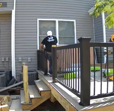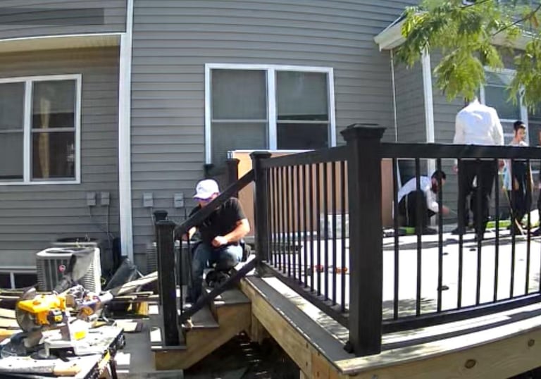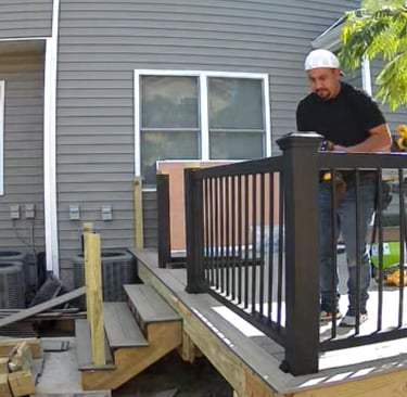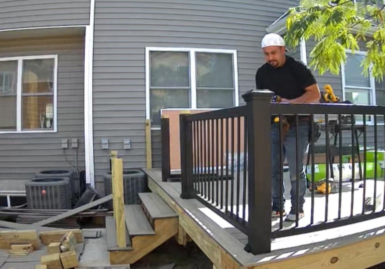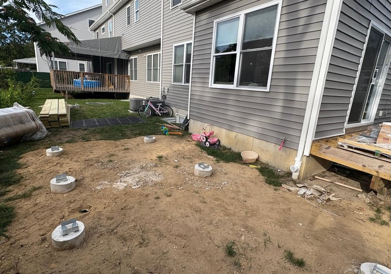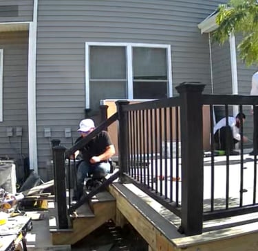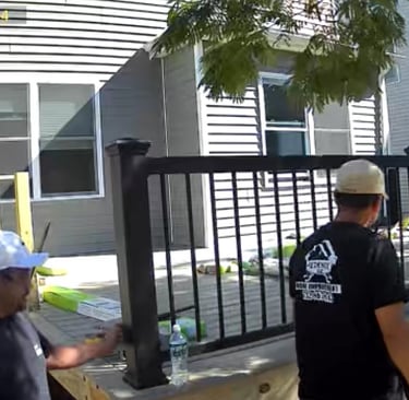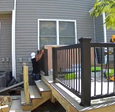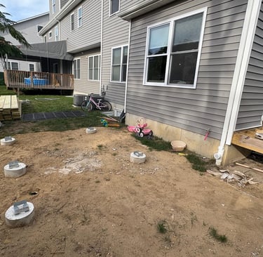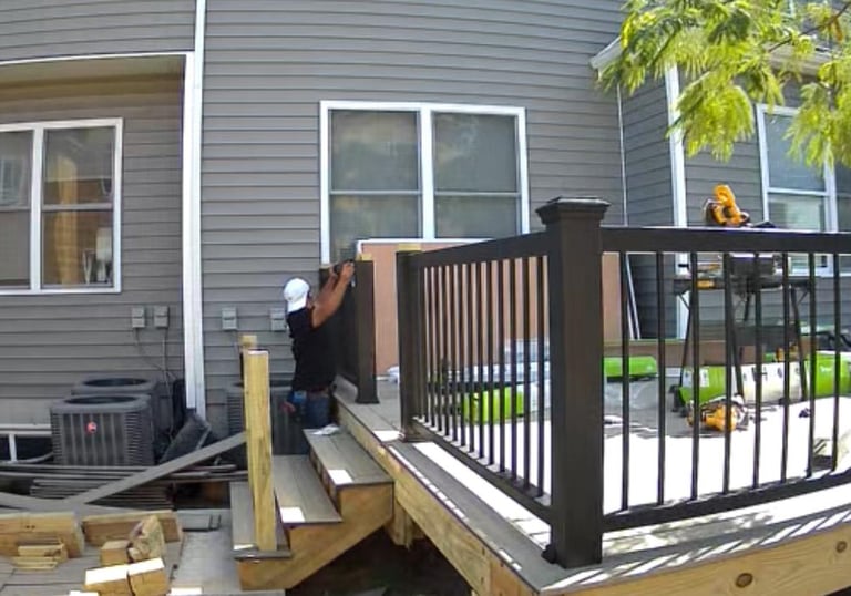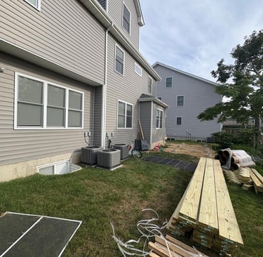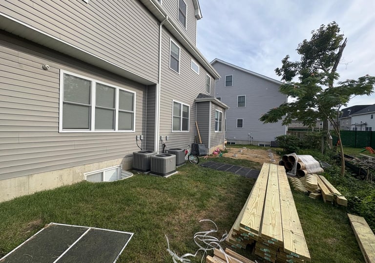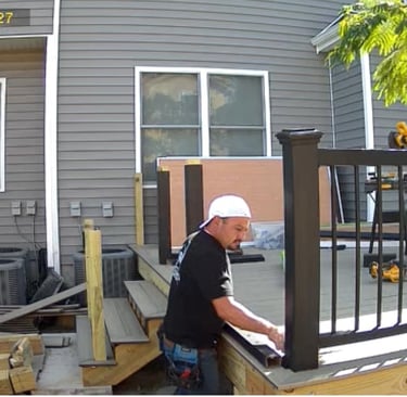 We designed and built an elevated deck featuring durable Trex composite flooring and a matching staircase for easy access to the yard. The deck is finished with a modern white and black PVC railing system, combining safety with a clean, elegant look.